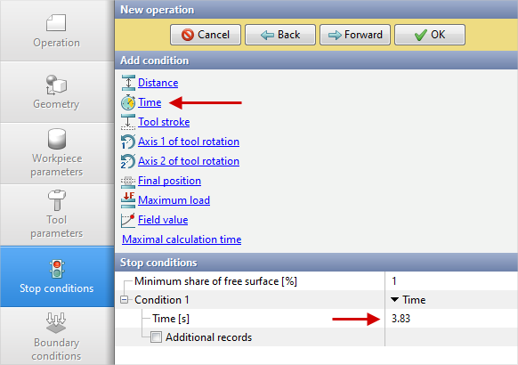 16.In the tab Stop conditions set the time to 3.83 s as for the first operation. Click Forward