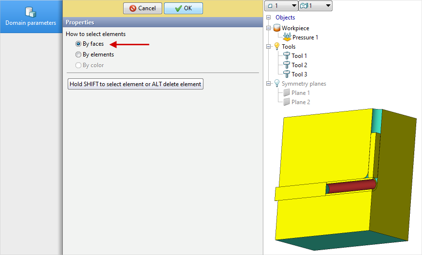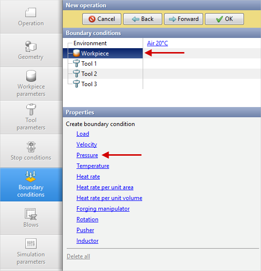 7.In the tab Boundary conditions it is necessary to set the pressure inside the workpiece. Select object Workpiece, and a list of boundary conditions will appear below. Click Pressure