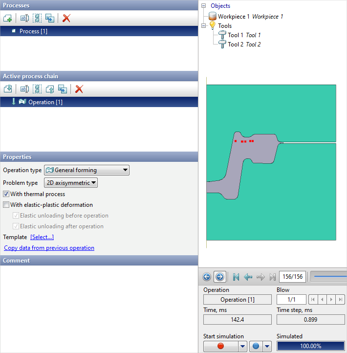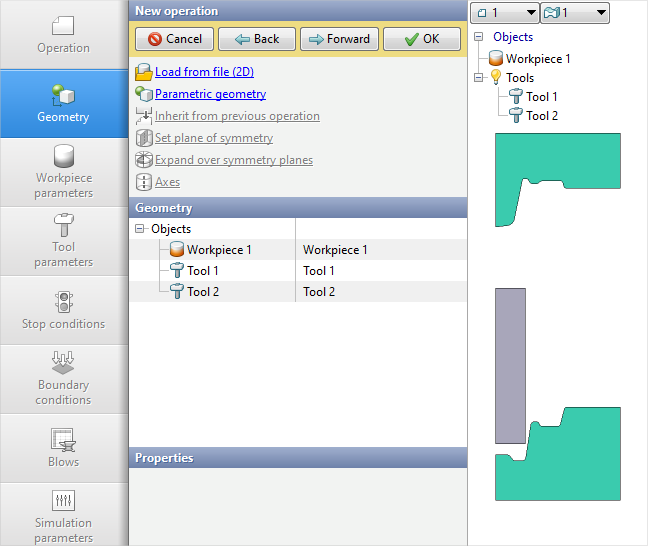 2.In the tab Operation select Operation type - General forming, Problem type - 2D axisymmetric. Click Forward