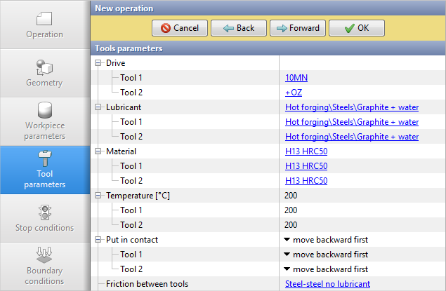 5.In the tab Tool parameters drive type, temperature and lubricant should be select for each tool. Opposite Drive-Tool 1 click [Select...] the database window will open. Choose equipment Standard\Mechanical press\10MN and double click on it, after that the selected drive will appear opposite Drive-Tool 1. Tool 2 - fixed, and it acts in the direction of the OZ axes. Opposite Drive-Tool 2 click [Select...], in the equipment database window, select Fixed drives\+OZ and double click on it,the selected drive will appear opposite Drive-Tool 2.
