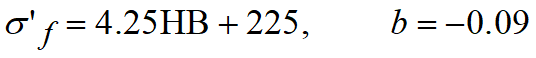 When this item is activated, the hardening or softenning that occurs as a result of tool strain is added or subtracted from the cyclic strength coefficientσ'f , respectively.. This function only works with a given cyclic hardening curve. Available materials. The database contains 4 pre-made material for work with the subroutine Fatigue DB. The materials are in the standard database folder Tool life: H13 AISI, 1.2344 DIN, 4Х5МФ1С-ЭП572 GOST H11 AISI 1.2343 DIN, 4Х5МФС GOST L6 AISI, 1.2714 DIN, 5ХНМ GOST M2 AISI, 1.3343 DIN, R6M5 GOST In the absence of experimental data for preliminary simulation, you can use the following dependencies using the Roessle-Fatemi hardness method: