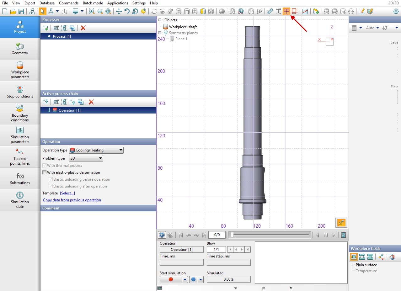 After activating this tool, a window Measurements appears, which has two tabs for 2D simulation: On the surface and In plane. An additional tab In crosscut plane will be added for 3D simulation. By default the On the surface tab is active, which prompts the user to assign two points on one or two different objects, between which the distance will be measured. Each point is assigned by double-clicking on the surface or cross cut plane of the object:
