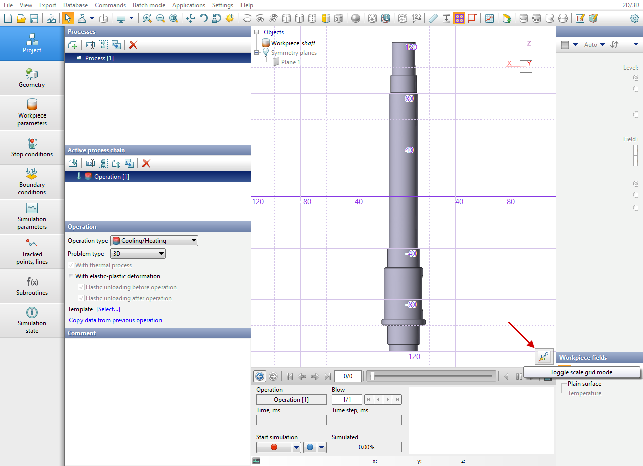 In addition to double-clicking, manual specifying of coordinates is also available. To do this, click on the drop-down list, enter the coordinates and click OK. After specifying points in the window Measurements their coordinates, the distance between points and the difference in coordinates are displayed. At the bottom of the window Measurements you can switch to the In crosscut plane and In symmetry plane tabs. Using these tabs, the user can measure the horizontal and vertical dimensions of objects and distances between objects. Measurement In symmetry plane can be performed in a 2D simulation or in a 3D simulation with symmetry planes.