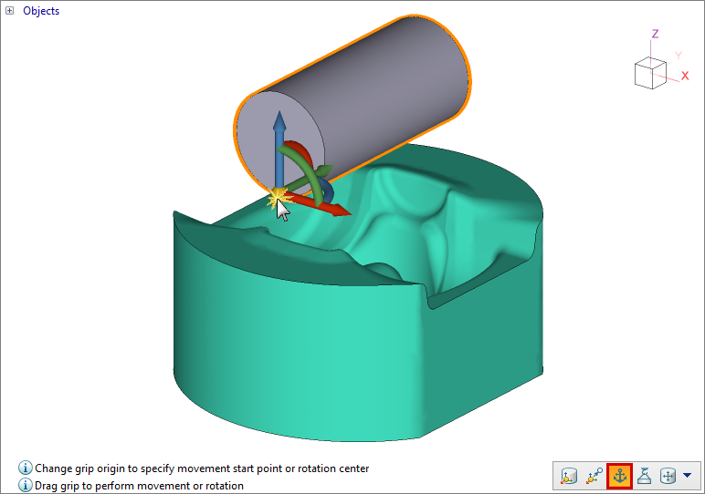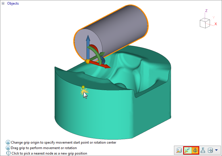 To move the grip, it is necessary to select and move its center. If the Ctrl key is held down, the center is attached to the object's nodes.