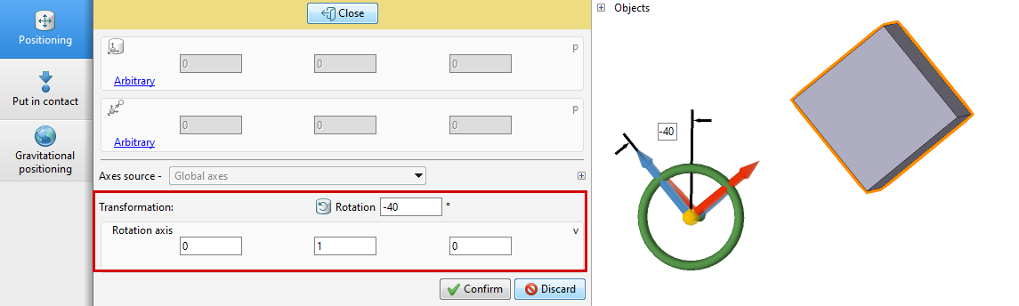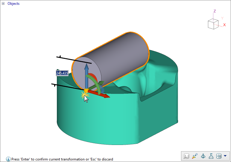 To move selected objects, pull the grip arrow, to rotate, turn the grip arc. In the input field, the distance in millimeters and the rotation angle in degrees are specified. To confirm the changes, click Confirm .