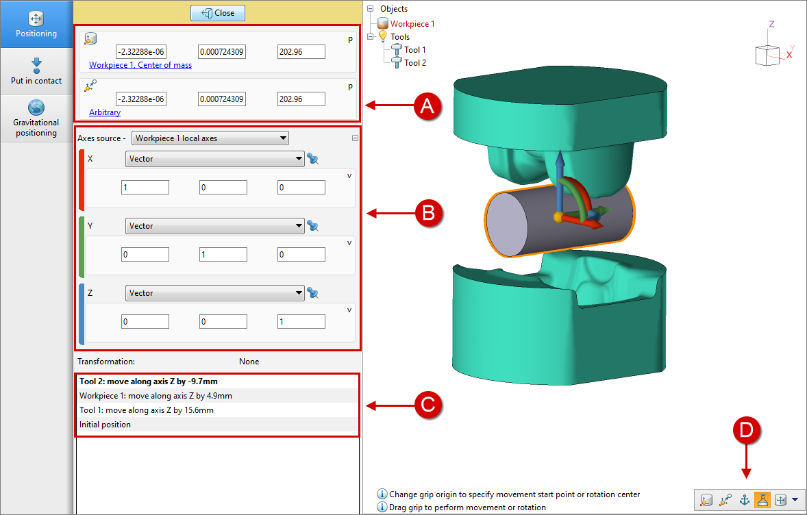 Positioning is carried out using a grip. In each mode, you need to position the center of the grip and move or rotate selected objects relative to it.