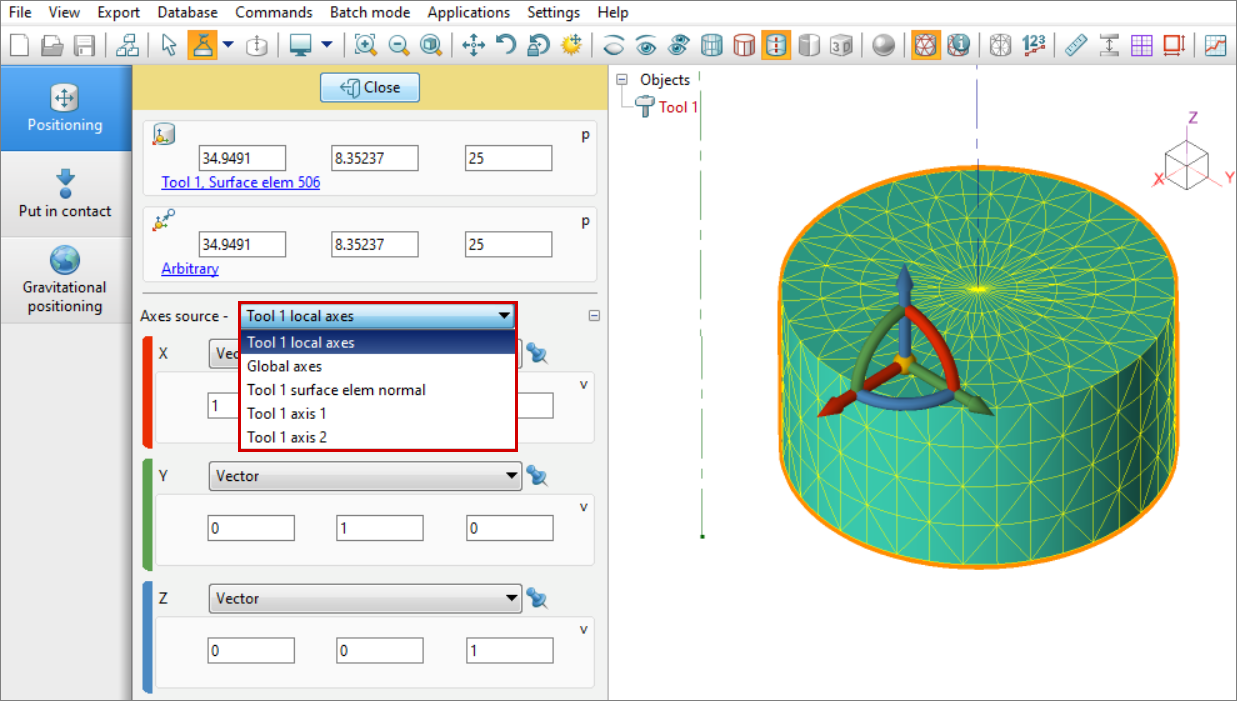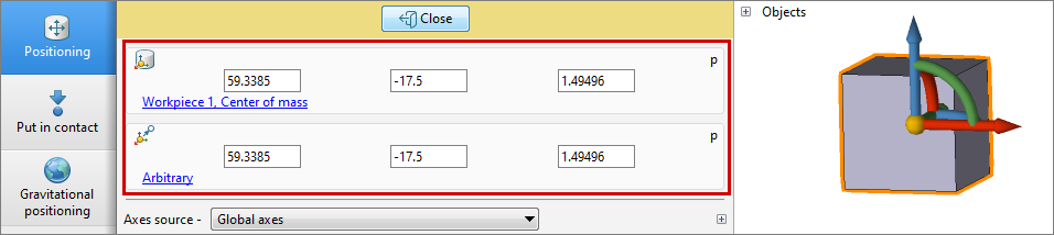 To position a specific object, you need to select it in the results window or in the object tree.