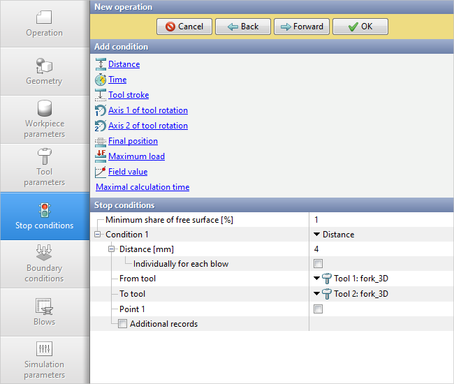 In the Stop conditions tab you must specify one or more conditions to stop the solver. The Simulation will stop when at least one of them is reached. The required condition must be selected in the Add condition window: The following stop conditions are available: Distance - sets the distance between the specified tools. Time - process time is set. Tool stroke - sets the displacement of the selected tool. Axis 1 (Axis 2) - tool rotation - sets the rotation angle of the tool around the given Axis 1 or Axis 2. Final position - simulation stops when the tool reaches the position user defined during positioning. Maximum load - the simulation stops when the specified load on the specified tool is reached. Field value - the simulation stops when the specified conditions for the calculated fields of the deformable workpieces are reached: Coordinate, Velocity, Temperature, Plastic Strain, Strain rate, Effective stress. Maximal calculation time - the simulation stops when the duration of the simulation exceeds a certain value. It can be useful when simulation several projects sequentially in the batch mode as a safety lock from hangs. More details are provided in the section ***Stop conditions. |