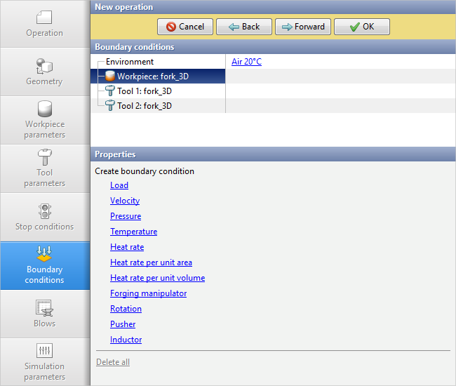 In the Boundaryconditionstab advanced simulation condition can be set: environment parameters , boundary conditions for tools and workpieces: Environment - this is the environment with which workpieces and tools interact. Properties of the Environment stored in ***DatabasesurroundingWednesdays. The following parameters are indicated in the environment fit by : environment temperature, emissivity , heat transfer coefficient , also for simulation diffusion processes - concentration and mass transfer coefficient. By the default Air 20˚C is specified as the Environment. It is possible to set additional local domains of the environment. With the help of boundary conditions, local velocity, pressure, heat rate and other advanced condition for the workpieces are set. Boundary conditions for tools must be assigned in the case when it is required to tool simulation in the Postprocessor mode or carried out coupled tool deformation simulation.