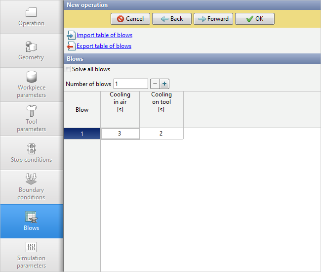 In theBlows tab the number of blows in the operation, the cooling time in the environment and in the tool, and other parameters are specified: The Energy share parameter is used only for hammer and screw press forging and indicates how much of the equipment's energy is spent per blow. The figure below shows an example of setting the parameters of blows during hammer forging: three blow are set, the transport time from the furnace is 3 seconds, the cooling time of the workpieces in the dies between blows is 1 second, each blow consumes, respectively, 50%, 70%, 100% of the hammer energy :