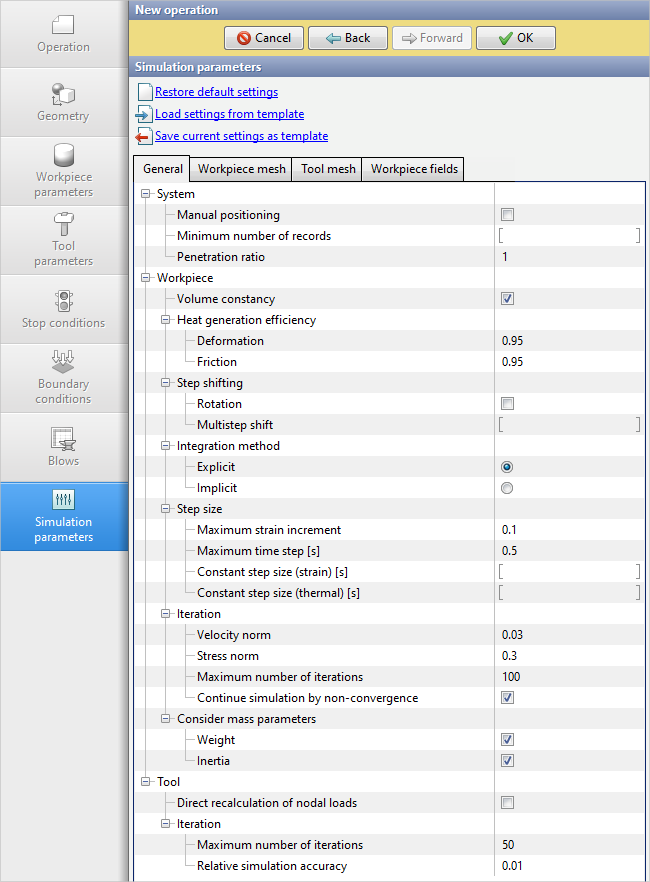 In the Simulation parameters tab the integration method, step size, mesh parameters, and other simulation parameters are specified. The Simulation parameters are divided into three groups: General, Workpiece mesh, Tool mesh, Workpiece fields: More details are provided in the section ***Simulation parameters. |