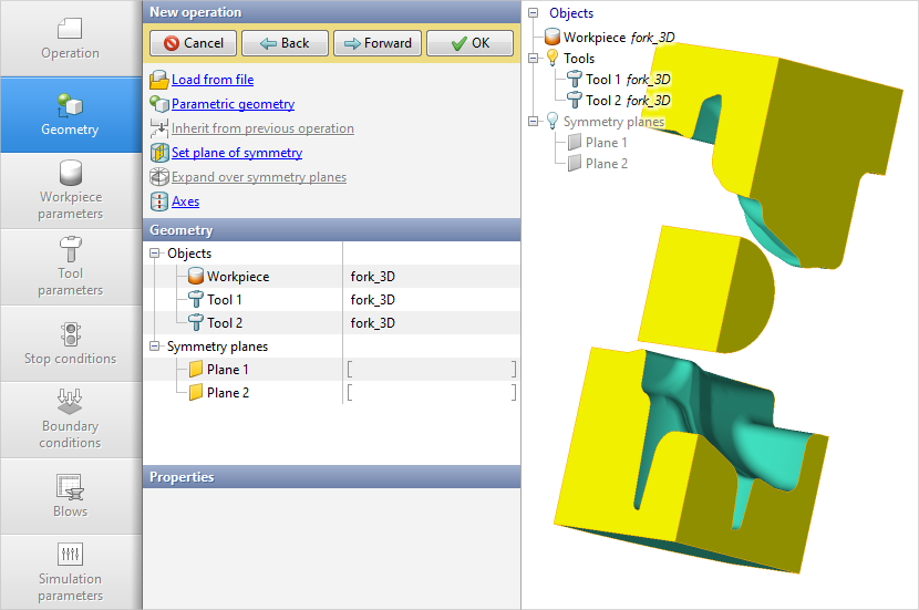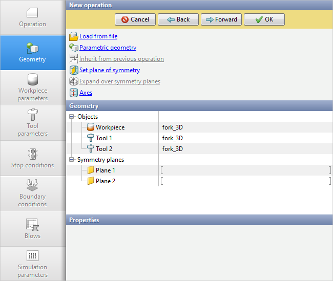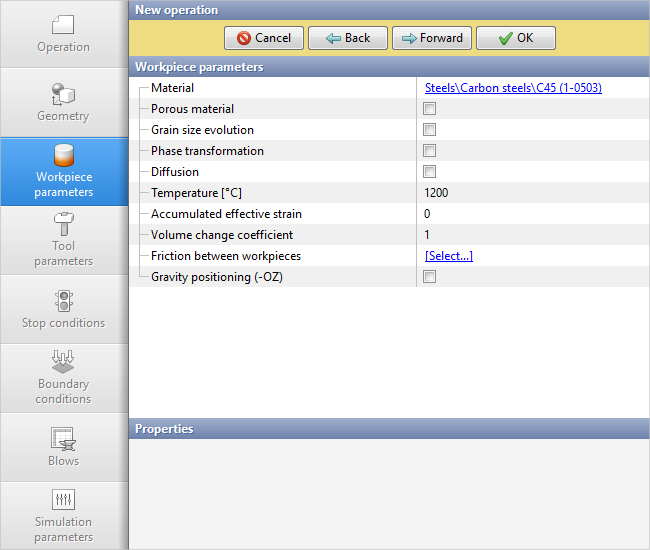 In the Workpiece parameters tab material, initial temperature and other workpiece parameters are indicated: