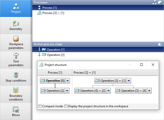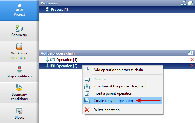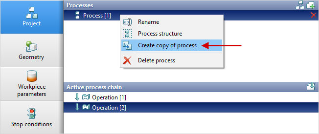 To create a copy of a Process you need to right-click on the corresponding process and select Create copy of process. To create a copy of an operation, right-click on the corresponding operation and select Create copy of operation. The program will offer to copy all continuations of the selected operation, if there are any: Clicking the Project structure button opens a window with all created processes and operations chains. In this window, you can activate, create, copy, delete or rename operations and processes, insert or delete intermediate operations, and activate the desired chain of operations. For more information, see the Project section. |