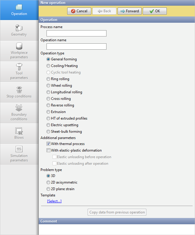 In the Operation tab, the operation name, Operation type, Problem type and other parameters are specified: The Operation type block specifies which process will be simulated. When simulating the operation type General forming the program by default simulates the visco-plastic deformation of the material taking into account thermal processes: heat transfer of the workpiece with the tool and the environment, thermal conductivity, heat generation as a result of deformation and friction. Thermal processes listed above will not be taken into account in the simulation if the With thermal process check box is deactivated. If the With elastic-plastic deformation check box is activated, the simulation will additionally take into account the elastic properties specified in the deformed material model. Operation type Cooling/Heating involves the simulation of the workpiece cooling or heating as a result of interaction with the environment or tool. If the With elastic-plastic deformation check box is activated, the simulation will also take into account the elastic-plastic properties specified in the deformed material model during cooling or heating. Types of operation Cyclic tool heating, Ring rolling, Wheel rolling, Longitudinal rolling, Cross rolling, Reverse rolling, Extrusion, Profile cooling, Electric upsetting, Sheet-bulk forming - these are special modules that can be used if the appropriate license options are available. In the Problem type tab one of the following types can be selected: 3D, 2D axisymmetric, 2D plane strain. In the Template block it is possiblle to load the initial data for simulation from Operation templates Database. More details are provided in the Operation section. |