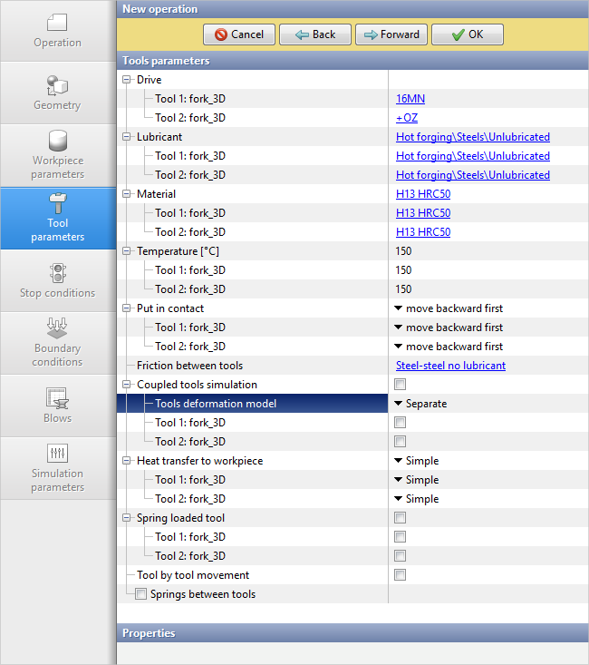 In the Tool parameters tab tools drives, lubricant between the workpiece and tools, material, initial temperature and other tools parameters are indicated: Drives are assigned from the Equipment Database. hammer, mechanical, hydraulic, screw press, load holder, as well as a universal drive that allows you to set the translational and rotation movement of the tool are available in the equipment database . All stationary tools are set to the fixed drive type. Lubricant is assigned from the Lubricants Database. In the lubricants model, the parameters of friction and heat transfer between the workpiece and tools are set. Material Tool material is assigned from the Tools materials database. The tool material model contains mechanical and thermophysical properties. It is possible to activate a coupled deformation task: