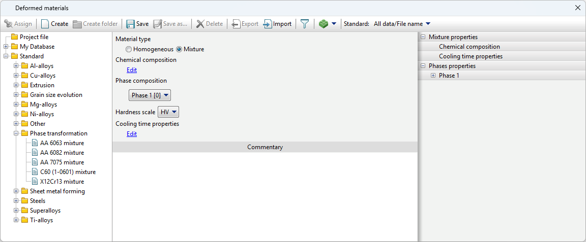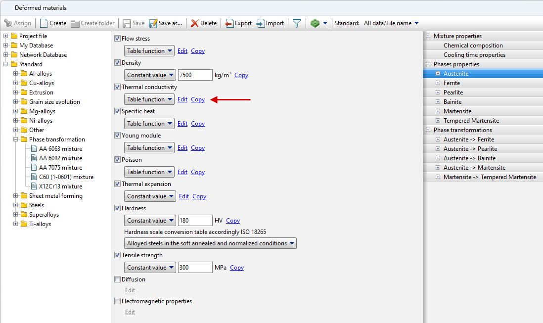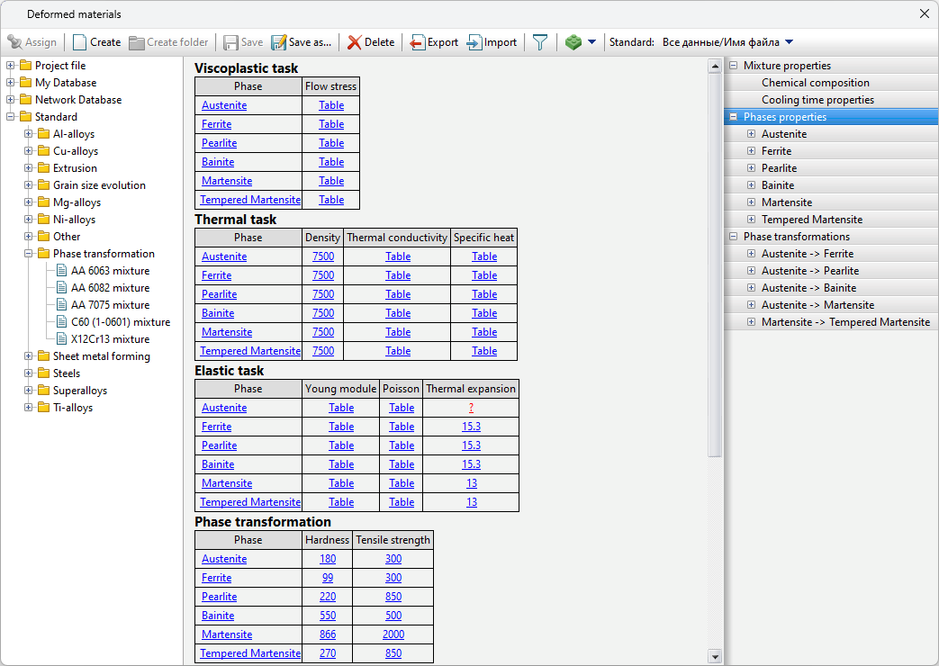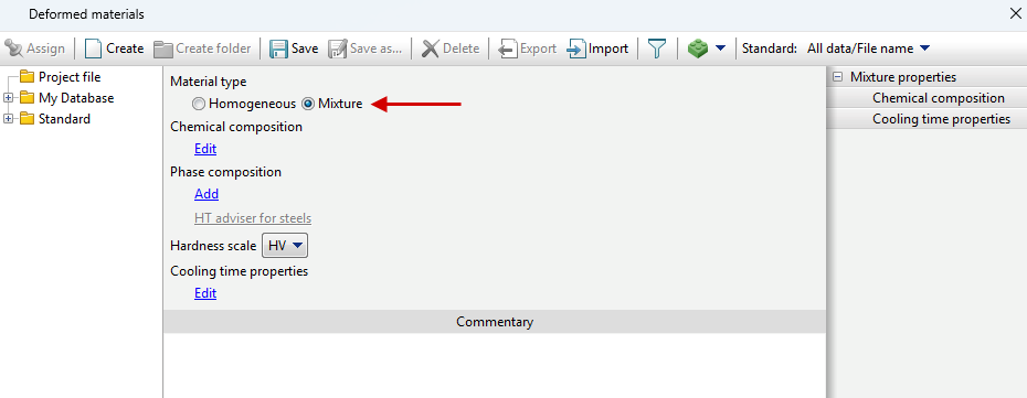 In addition to creating mixture materials manually, it is possible to create them using the QForm UK phase transformation property generation wizard HT adviser for steels (for general steels only, calculates properties based on the specified chemical composition).