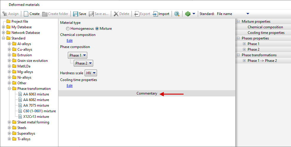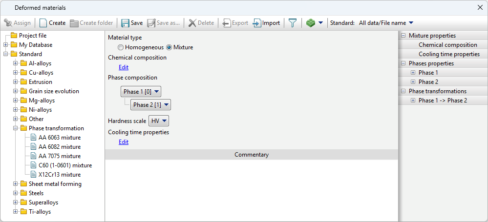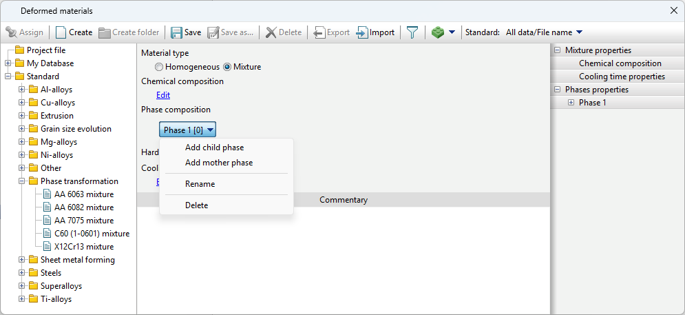 For simulations in Phase transformations module, mixture (multiphase) materials need to be created. First, the phase composition of the material need to be specified, then the properties of each phase.