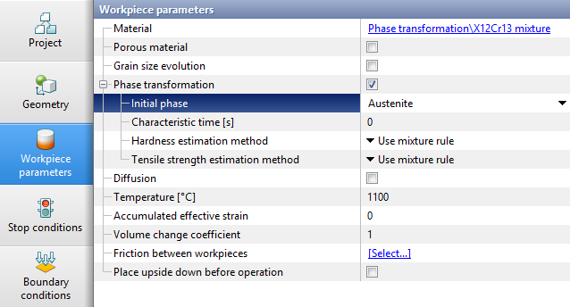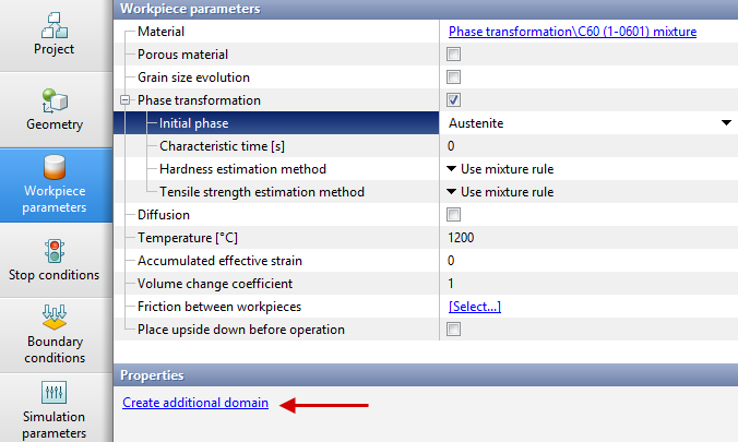 When simulating the operation in module Phase transformations, the initial phase or a mixture of multiple phases must be selected from the drop-down list in the Workpiece Parameters. If you want to specify the initial percentage of phases in the workpiece, you should select the Mixture option in the Initial phase line. When specifying hardness and tensile strength in the material model for Characteristic temperature interval, the calculation method should also be switched to Use characteristic temperature interval. In case there is a need to set different phase compositions in different parts of the workpiece at the initial moment of the operation, click on the Initial phase, and then in the Properties window, click the Create additional domain button. Next, you need to create an additional domain of the desired shape and then to position it. Below the line Initial phase the line Initial phase 1 will appear, for which you can select the initial phase or mixture in the same way. |