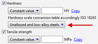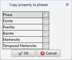 The set of phase properties is similar to the set of properties of homogeneous material. In order to simulate the phase composition change during heat treatment, values for density, thermal conductivity and heat capacity must necessarily be given. In order to predict warpage during heat treatment, it is necessary to additionally specify the properties necessary for the calculation of the elastic-plastic problem: flow stress, Young's modulus, Poisson's ratio, thermal expansion coefficient. If the values of the specified properties are not set for a phase, they will be copied from the phases for which they are set (if they are set for at least one phase). For Predicting operational properties of workpieces after heat treatment, the user can specify properties: hardness, tensile strength. The hardness is given in Vickers ( ISO 6507). For hardness conversion for each phase, there is an option to select a hardness conversion table from ISO 18265. When analyzing the results, both the Vickers hardness field and the hardness field of the selected scale can be displayed. In the comments section you can specify the necessary information about the created material. After setting all phase properties, you can open the Phase properties tab to display summary tables with phase properties. If no value is set for a property, a red question mark will take the place of the value. If you want to copy a material property for multiple phases, you can use the Copy option. Next, you should select to which phases to copy the selected material property. |