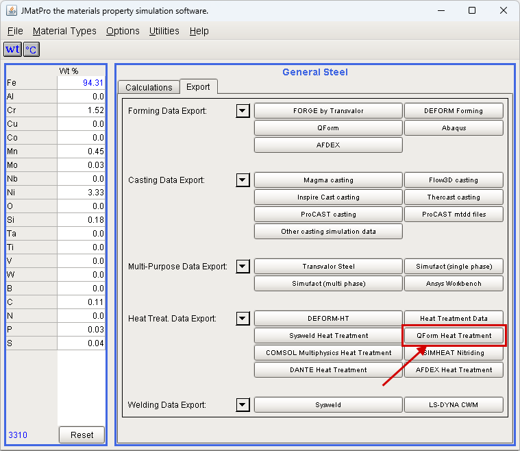 Starting from JMatPro v.10, it is possible to export to QForm UK the properties of phases: austenite, ferrite, pearlite, bainite, martensite, as well as parameters of phase transformations - both direct (from austenite to child phases) and reverse. To export, click on the QForm Heat Treatment button after filling in the chemical composition for the specific material. |