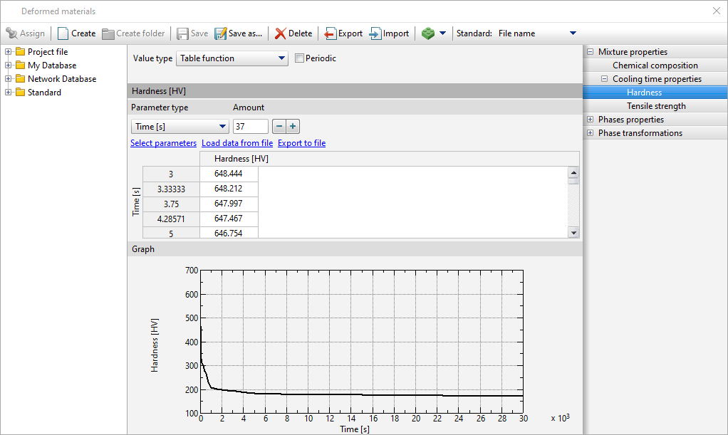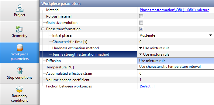 In module Phase transformations, there are two methods for predicting the performance properties of a part after heat treatment: by mixture rule and by characteristic temperature interval. The selection of one method or another is done on the Workpiece parameters tab