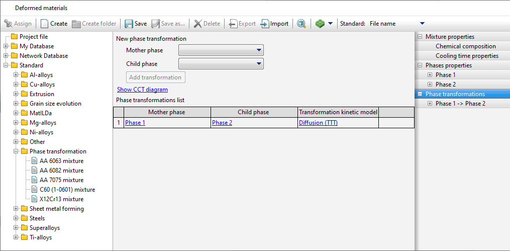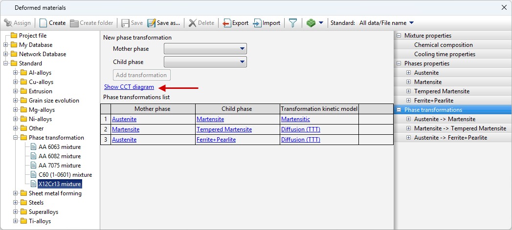 To display the CCT diagram window, you must click Show CCT diagram in the Phase transformations tab. It can also be displayed by clicking on a similar label in the Transformation model tab.