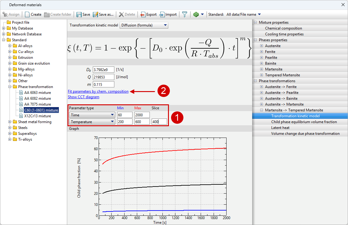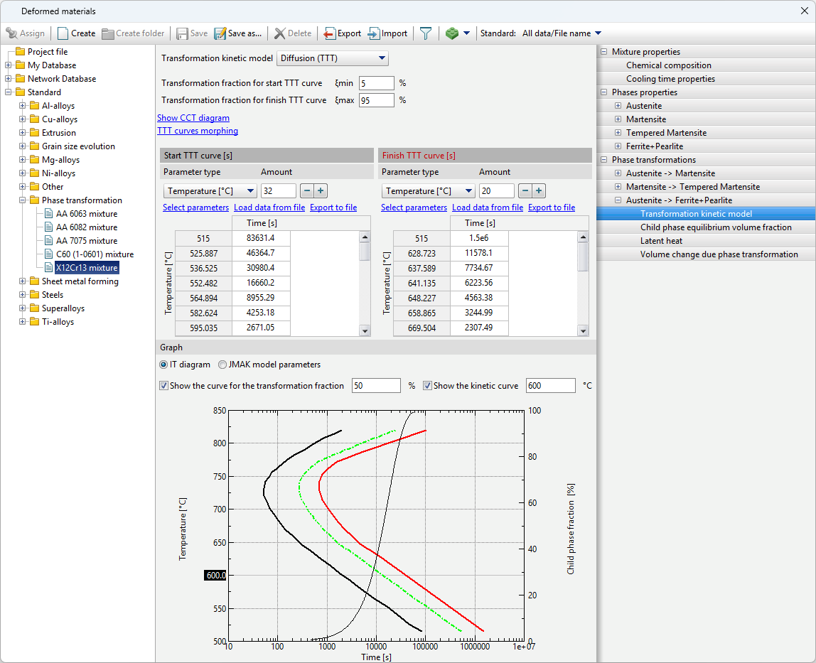 The diagram represents curves corresponding to the beginning of the transformation (volume fraction of the child phase ξmin), the selected value of the transformation fraction (the Show the curve for the transformation fraction option) and its completion (volume fraction of the child phase ξmax). The chart shows how long it takes for the child phase share to increase from ξmin to ξmax at a given temperature. Since the typical values given in the reference literature for ξmin and ξmax are 1 and 99% or 5 and 95%, then the total phase transformation time at a given temperature can be estimated from the diagram.