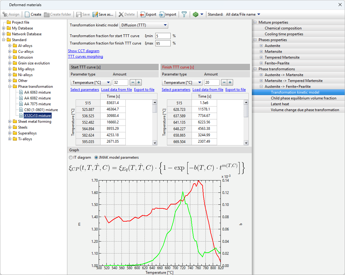 The JMAK (Johnson-Mehl-Avrami-Kolmogorov) model is used for calculation, the parameters of which are given by the TTT-diagram