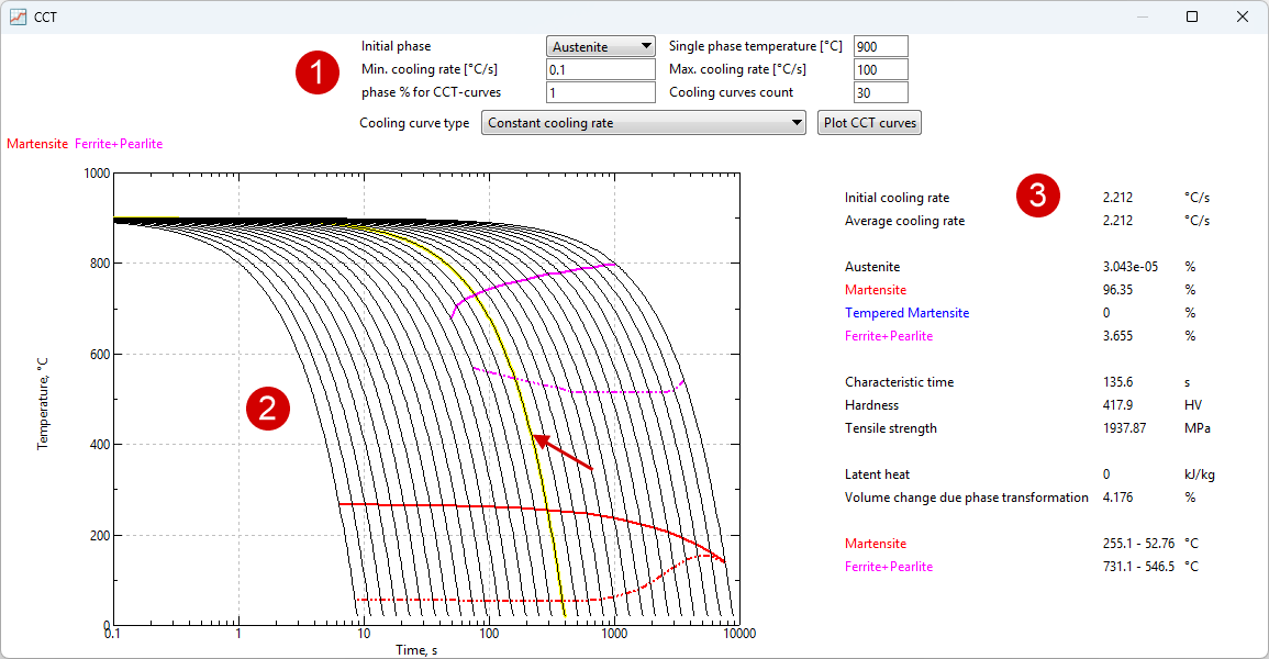 1.Diagram display settings. 2.CCT diagram. If you move the cursor over a cooling curve in zone 3, information about it is displayed. 3.Predicted properties after cooling at a given (highlighted curve) rate.