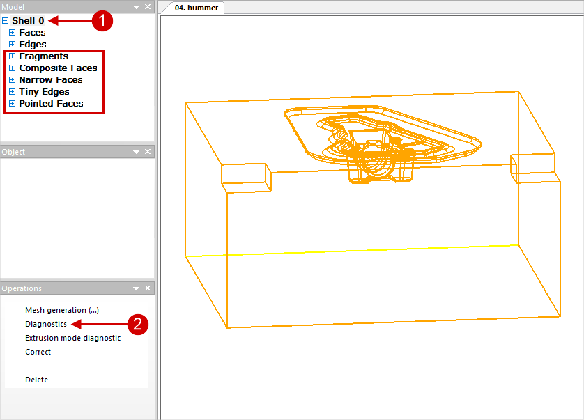 At the stage when the model is represented by a shell (Shell), it is always recommended to run diagnostic. To do this, you need to select the appropriate shell Shell 0, 1, 2... and in the window Operation execute the Diagnostic command. The Software can report unfavorable parts of the model which are recommended to be corrected for subsequent successful generation of the finite element mesh. The figure below shows a list of typical objects to fix: Fragments, Tiny Edges, Narrow Faces, Composite Faces, Pointed Faces All unfavorable parts of the model can be auto corrected with one click. To do this, select Shell and in the window Operation click to Correct. After that, the software will fix all critical places on its own. During correction, new problematic edges and surfaces may appear, so it is recommended to select again Shell and in the window Operation click Diagnostic, and then - Correct: