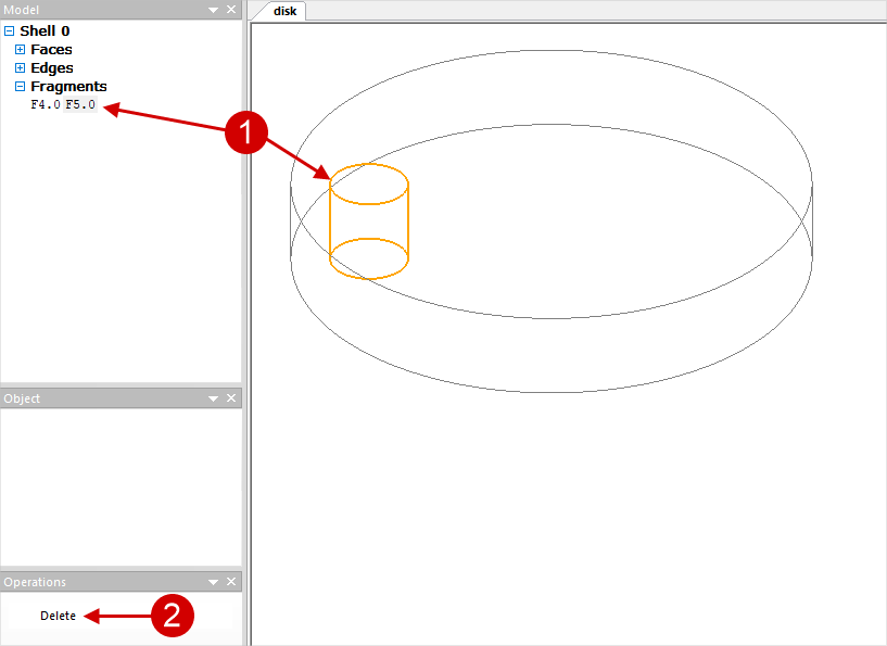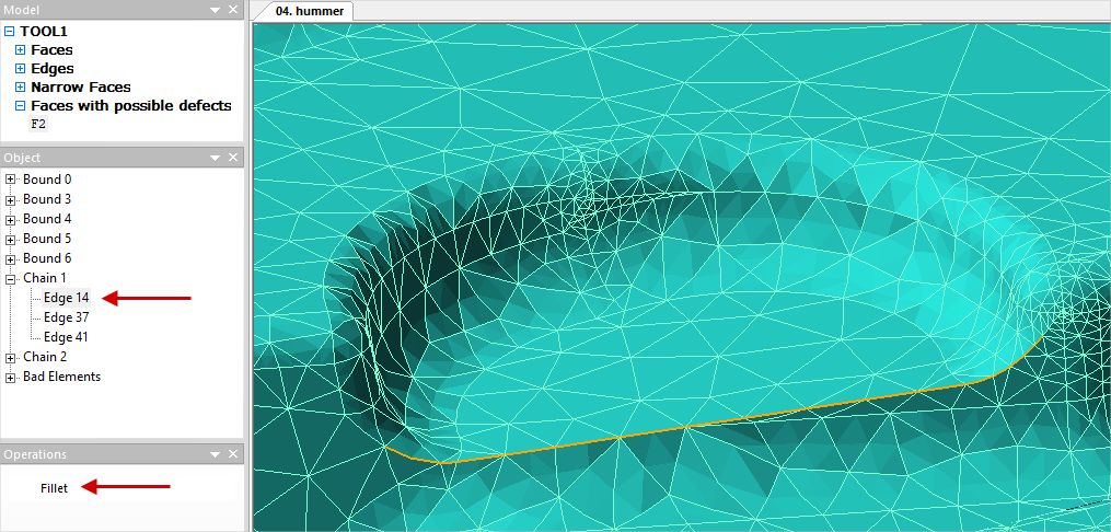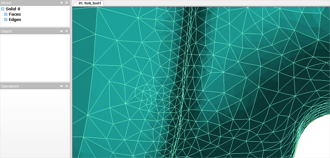 With automatic correction, not all problematic edges and surfaces are shrunken and separated, but only the most critical ones, the change of which at the same time does not lead to a strong distortion of the initial geometry. In most cases, automatic correction is sufficient, and you can proceed to finite element mesh generation. See below for more details on the different types of problematic edges and surfaces. Fragments (fragments) are isolated part of the plain surface, which, if necessary, can be removed without violating the integrity of the model. Often the software designates some parts of the shaping plain surface of the tool as fragments, as in the figure above, such fragments should not be deleted. You can delete, for example, technological holes, recesses, inscriptions, if they are not important for simulation . This will lead to a simplification of the tool mesh and, consequently, to a reduction in simulation time . To delete an object, you must select the appropriate fragment in the list (this fragment will be highlighted in color on the wire fit by) and in the window Operation execute command Delete: Tiny Edges (small edges) - very short curves on the model that can interfere with good mesh. If you click "+" opposite to the listTiny Edges, it will be opened. Here parameter size (size) shows the ratio of the length of the edge to some scale value determined by the dimensions of the body. In parentheses is its reverse value. It is recommended to origin select the entire list by clicking on Tiny Edges, and execute the command Correct in the Operationwindow. Automatic correction is optimal and sufficient at the first stage of the model correction. In this case, only edges are shinked with the parameter size which have less than 0.002. Edges that do not satisfy this condition are not auto removed. Because removing them can lead to geometry distortion: