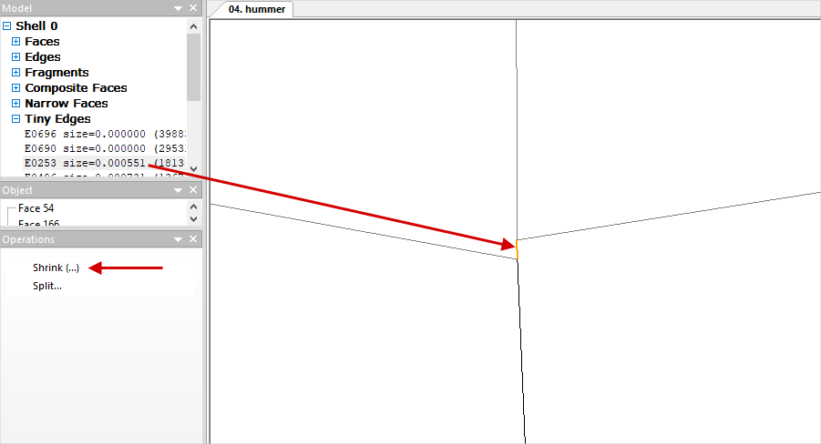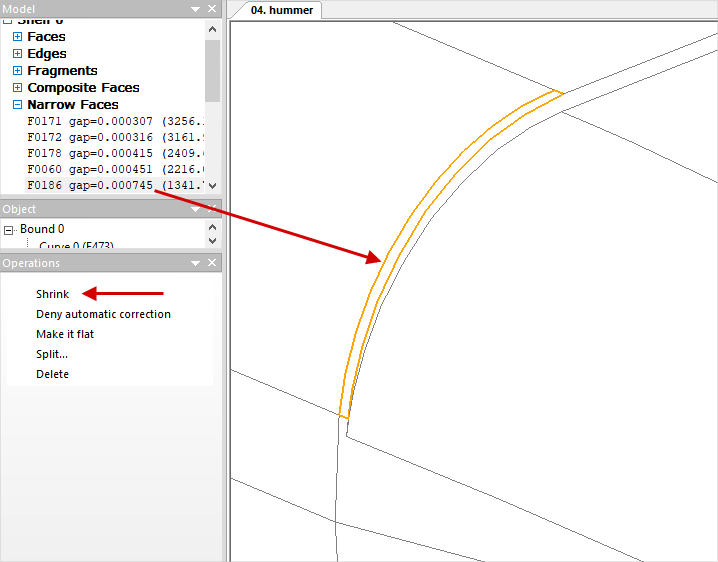 If necessary, Tiny Edgesthat are not auto corrected , can be corrected manually. In this case, it is recommended to control changes in the geometry. Since the edges are very small, they are difficult to find without magnification. The simple way to find the edge selected in the list on the wire model is as follows: select in the list Tiny Edges any edge, click once with the mouse wheel in domain of the wire model, move the wire model as far as possible by rotation the mouse wheel, zoom in on the model by rotation the wheel in the opposite direction, while the object selected in the list will be in the center of the approach, it will be highlighted in color. In the Operation window click command Shrink. In some cases, the software may not shrink the selected edge for some reason, then you can try to execute the command Shrink with the Ctrl button clicked. Tiny Edges shrink to a point: Narrow faces are narrow plain surfaces that can also adversely affect mesh generation. Like Tiny Edges, first you should try to fix it in auto mode. Listed Narrow faces parameter gap (gap) shows the ratio of the width of the elongated plain surface to some scale value determined by the dimensions of the body. The inverse value of this parameter is indicated in brackets (1/gap):