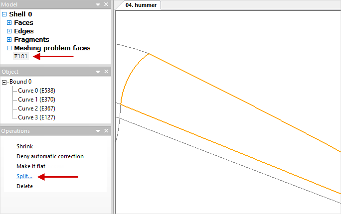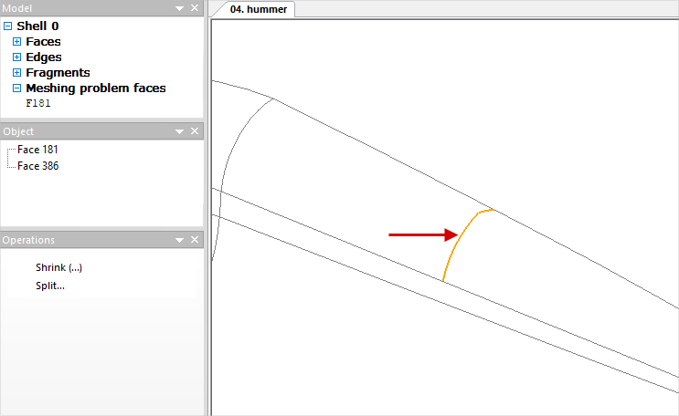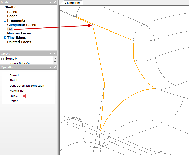 If you need to shrink individual Narrow Faces, which are not auto-shrunk, this can be done manually. In this case, visual control of corrections is important. Similar to the manual fix of Tiny Edges select the desired plain surface in the Narrow faces list and find it in the wire model, then run the command Shrink. In some cases, the software may not shrink the selected edge for some reason, then you can try to execute the command Shrink with the Ctrl button clicked. As a result of executing the commands, the selected Narrow face shrinks into an edge: Composite Faces are the plain surfaces with complex boundaries. It is recommended to correct all such plain surface before mesh generation . To do this, select the list Composite Faces and in the window Operation click Correct. All complex plain surface will be auto corrected and divided into several simpler ones: