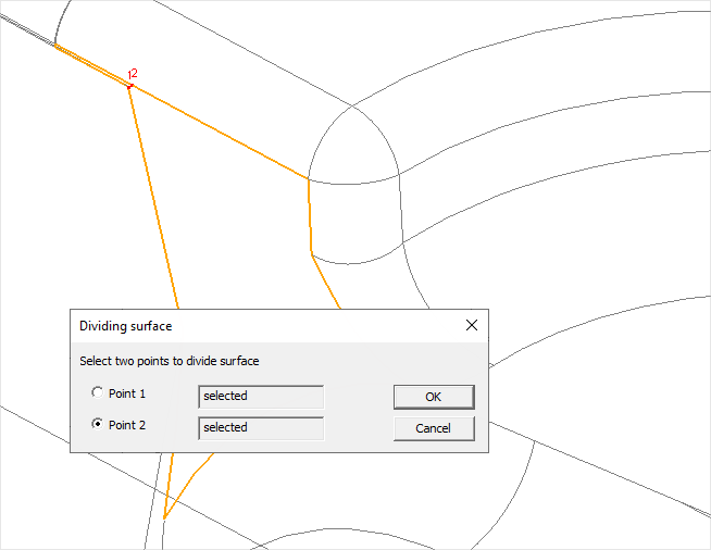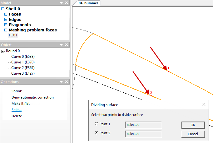 Composite Faces can be corrected manual if necessary. To do this, select any object in the list Composite Faces, and this object will be highlighted in color on the wire model. In theOperationwindow run theSplit command. In thePlain surface division popup window, you should select two points by double-clicking on the edges of the plain surface along which the selectedComposite facewill be separated on two plain surfaces. Select the points and click OK: Pointed faces (crescent plain surface) - it is recommended to correct similarly to Composite Faces: