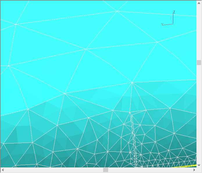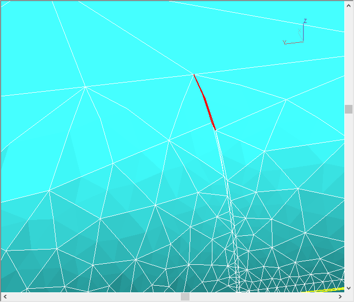 The most common mesh defects are bad elements (bad elements) and Chains (non-closed chain). Chains are not critical defects, and they should not be corrected. Bad elements should be corrected: their presence can lead to failure time simulation. Bad elements can be selected in the list and found on the finite element model. If you select one element on the bad elements list this element will be highlighted in color on the finite element model. After that in the Operation window, you need to execute the command Remesh. The figures below show a section of the mesh before and after remeshing : You can select several or all at once bad elements and try to remesh them: