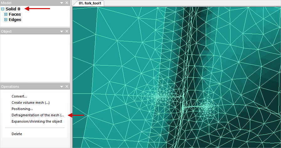 In the process of mesh generation, as well as as a result of correcting mesh defects, local condensations can form. A more uniform mesh can be obtained by selecting the corresponding named object in the window Model and running the command Mesh defragmentation in the window Operation: In some cases, as a result of defragmentation, there may again be bad elements, which need to be corrected. |
