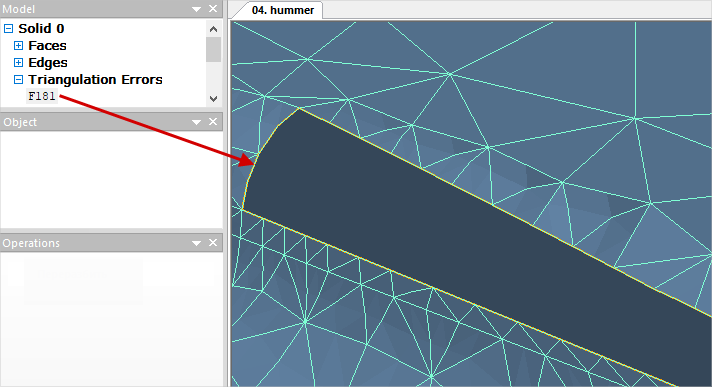 Originally you need to make sure that no Faces with possible defects or Narrow faces collections appear in the list of objects after the converting. If any of these collections appeared in the Model window, you need to examine its contents. The list contains plain surfaces on which problem areas were found. If you select any plain surface in this list, then in the window Object a list of all problem areas of this plain surface will be displayed: