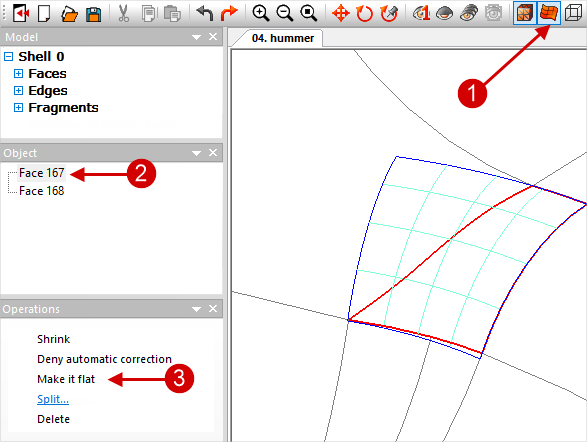 In some cases, when errors occur during the mesh generation, the problematic plain surface can conventionally be approximated by a flat plain surface, it can be made flat. You need to go back to the stage of work with the shell Shell, press the button Show spline plain surface on the toolbar, click on any edge next to the problem plain surface and in the Object window select the right Face. After that, the chosen Face will be painted over with spline lines, by which its curvature can be estimated. If the curvature is negligible, then this Face can be made flat by running the command Make it flat in the window Operation: |