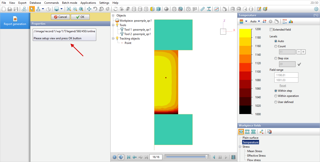 If the tag for adding an image to a report contains the parameter online, automatic report generation on this tag will be suspended, and the program will prompt you to configure the display of objects and select the required simulation field. Then you need to click OK, and report generation will continue according to the template script: