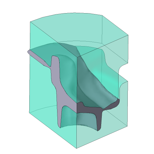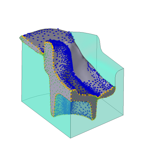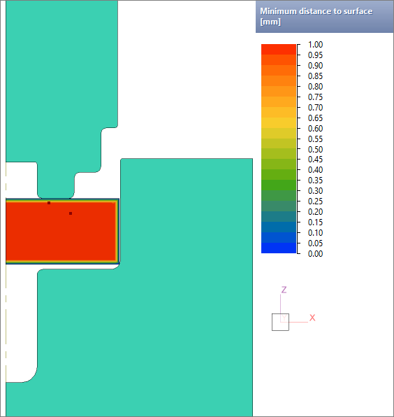 The Minimum distance to surface field can be used to analyze metal flow defects related to the inward drawing of metal from the surface. Sequence of actions for work with the field: 1.Go to the last simulation step; 2.Change the maximum scale value by the size of the studied near-surface layer. First of all, this value depends on the dimensions of the workpiece; 3.Make sure that the field is parallel to the final form of the workpiece surface. Use the Add section plane command to analyze the fields in different parts of the forging when simulating a 3D tasks; 4.In case of detection of places where the fields is drawn inward from the surface of the workpiece, it is recommended to additionally investigate the flow of metal with the help of an array of tracked lines and tracked undersurface flow lines.
