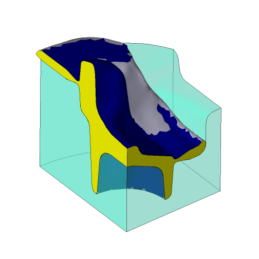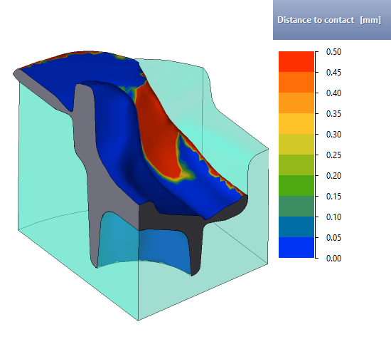To analyze the filling of a die cavity several tools are available: 1.Displaying the contact area (button 2.Displaying the contact nodes (button 3.Displaying the Distance to contact field (available in the field list). Shows the current distance to the tool surface as a field.