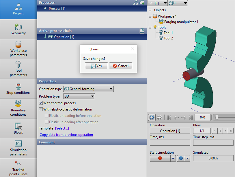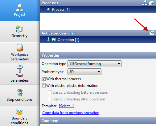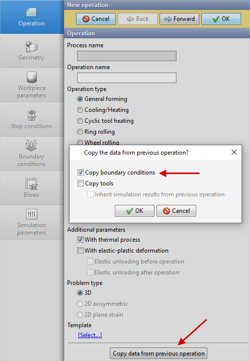 14.In the Operation tab select Operation type - General forming, With thermal process, Problem type - 3D. You also need to click on Copy data from previous operation and copy the boundary conditions. Click Forward.