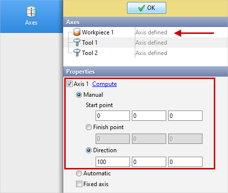 4.Click Axes and set the workpieces axis . Click Forward.