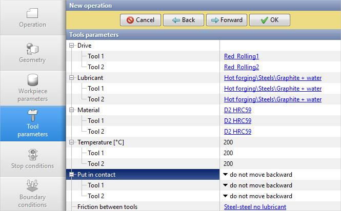 Opposite Material click [Select...] and double click to set the material D2HRC59. It is also necessary to assign the heating temperature Tools 1, 2 - 2 00°С. In the Put in contact sectionselect do not move backward. Click Forward