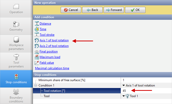 18.In the Stop conditions tab you need to set the rotation angle Tool 1 regarding own Axis 1 (45˚). Click Forward