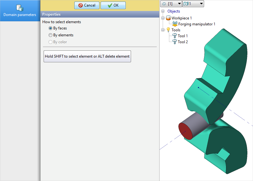 9.Next, you need to select the domain shape. Click Surface. Holding Shift button, select the workpieces face with the left mouse button. The selected face changes color. Click OK and then Forward.