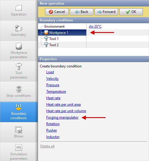 8.In the Boundary conditions tab you need to add a boundary condition for the workpiece Forging manipulator.