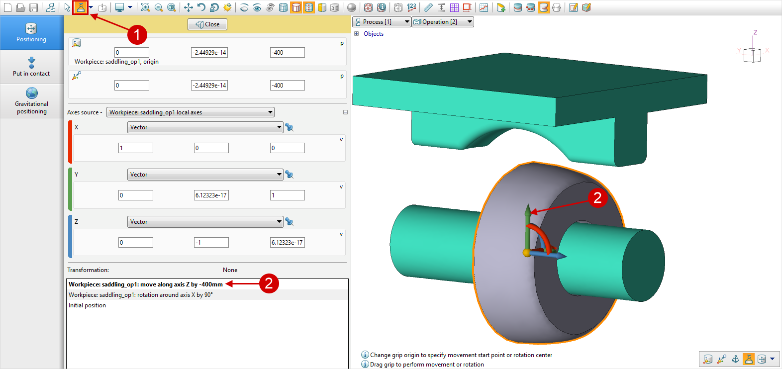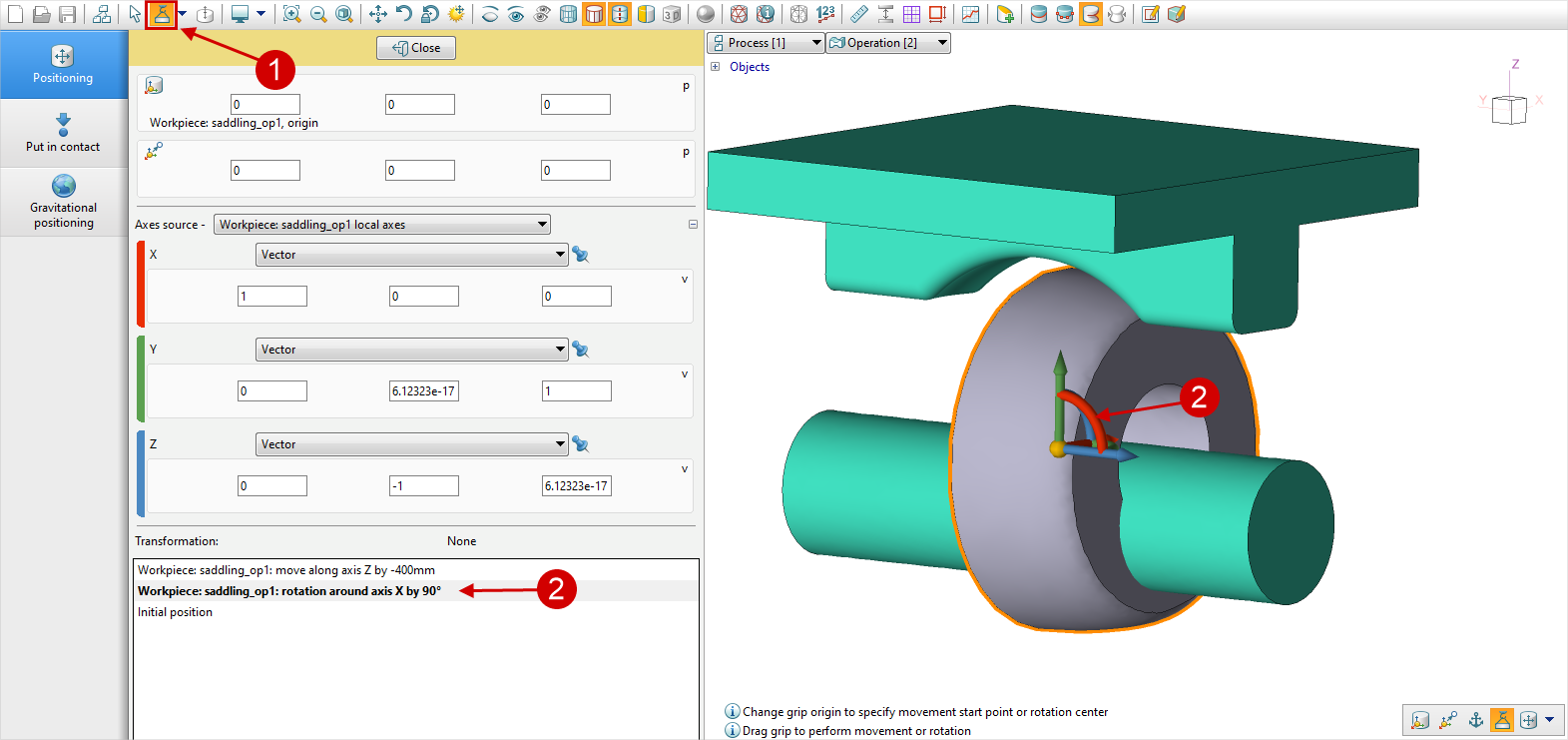 It is also necessary to move the workpiece down so that it does not intersect with the mandrel. Click on thePositioning, select the Workpieceand move it along the Z axis to the required distance. Closepositioning window .