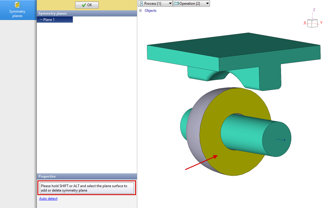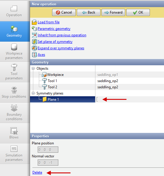 Since the symmetry plane does not rotate with the workpiece, it must be deleted and set again. Select from the list Plane 1 and in the window Properties click Delete.