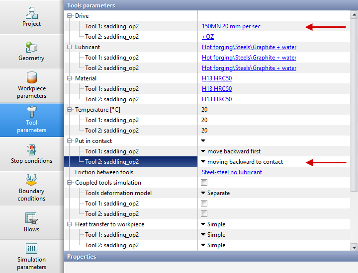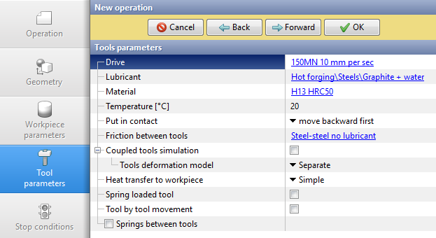 15.In the tab Tool parameters set the drive for Tool 1 - a 150 MN hydraulic press with velocity of 20 mm/s (it is necessary to create new equipment, as described for the first operation, but the velocity this time is not 10 mm/s, but 20 mm/s, since the symmetry plane is vertical), for Tool 2 - fixed drive+OZ. Specify the lubricant and material of the tools. In the column Put in contact - with a move backward to contact for Tool 2. Click Forward